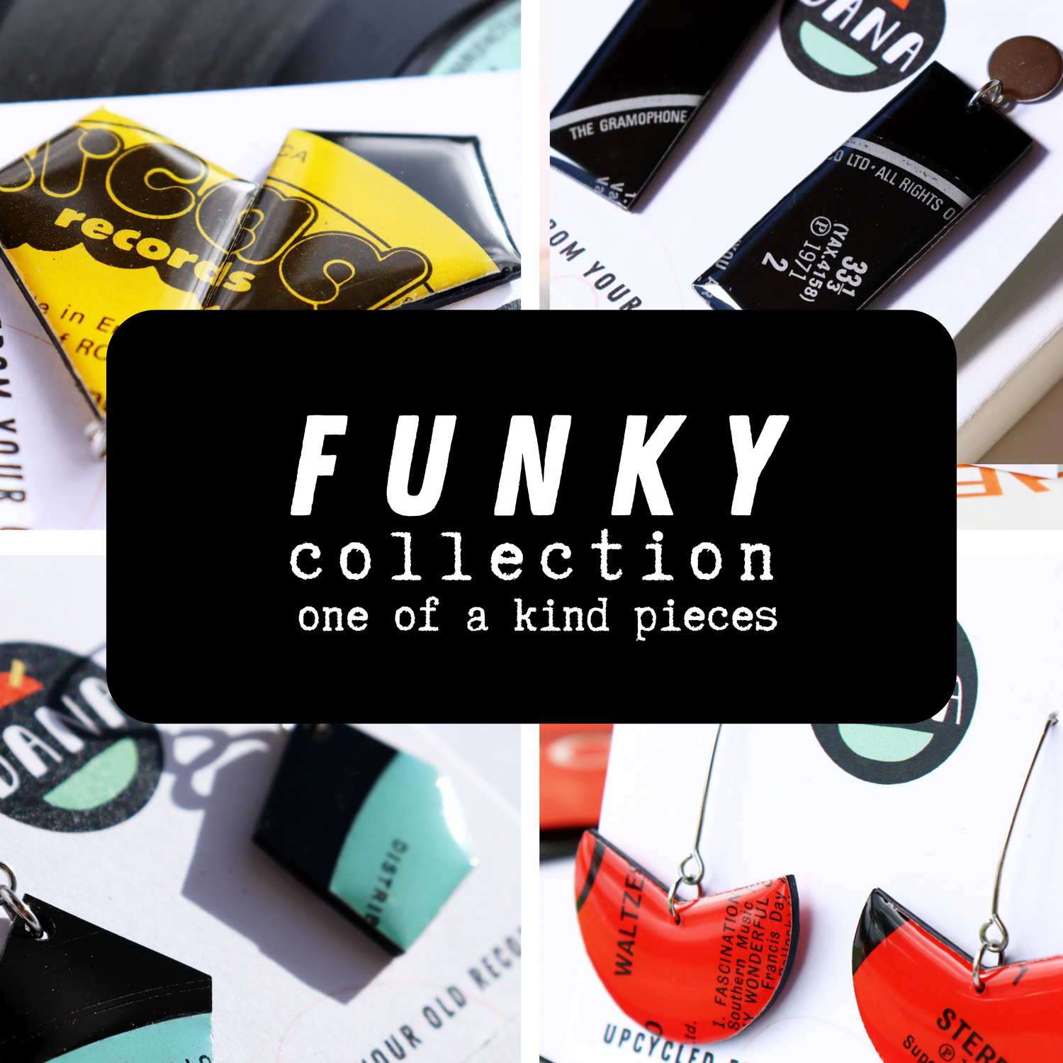 the FUNKY collection // ONE OF A KIND piecesRecycled funky vinyl record jewellery handmade in Ireland.