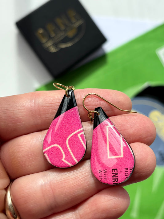 One of a kind upcycled teardrop earrings in black and fuchsia