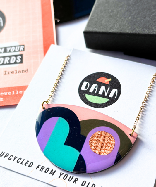 CLEO no.1 bold upcycled graphic necklace handmade in Ireland / olive, turquoise, fuchsia, plum, gold