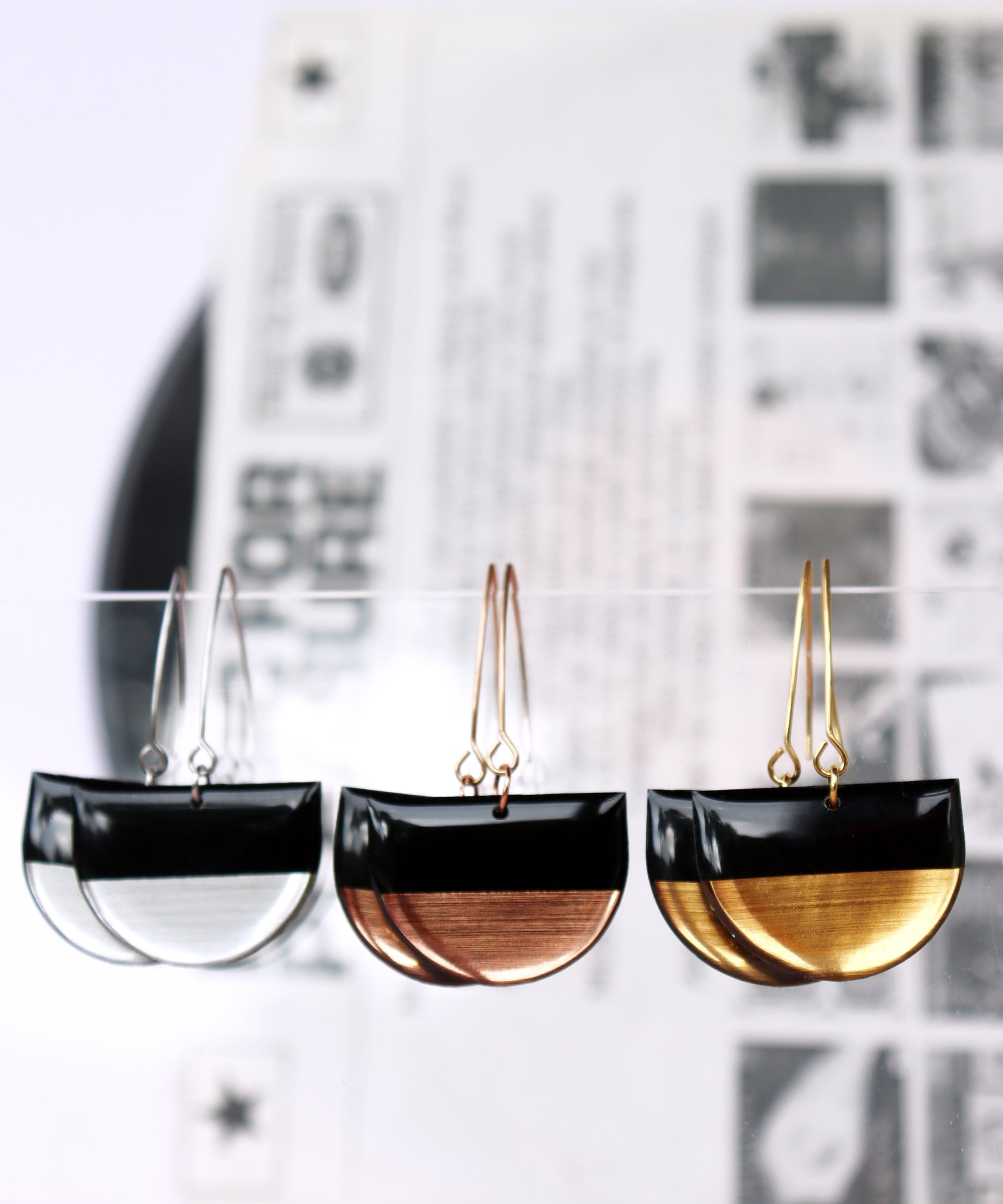 Minimal with a subtle touch of metallic shine, the MARGOT no.1  earrings are upcycled from a vinyl record that was saved from going to landfill. Oh you will love how the light dances over the metallic details for that subtle touch of glam. A great present for vinyl lovers, sustainable fashion enthusiasts or anyone on the lookout for that bold unique jewellery design.