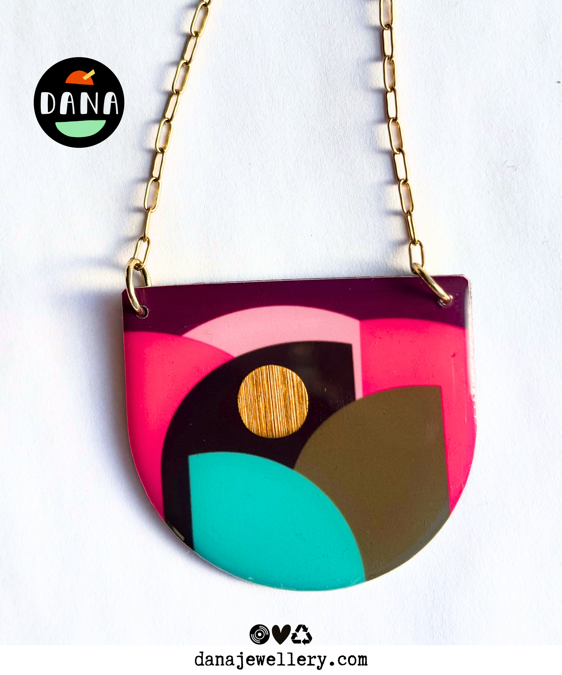 CLEO no.1 bold upcycled graphic necklace handmade in Ireland / olive, turquoise, fuchsia, plum, gold