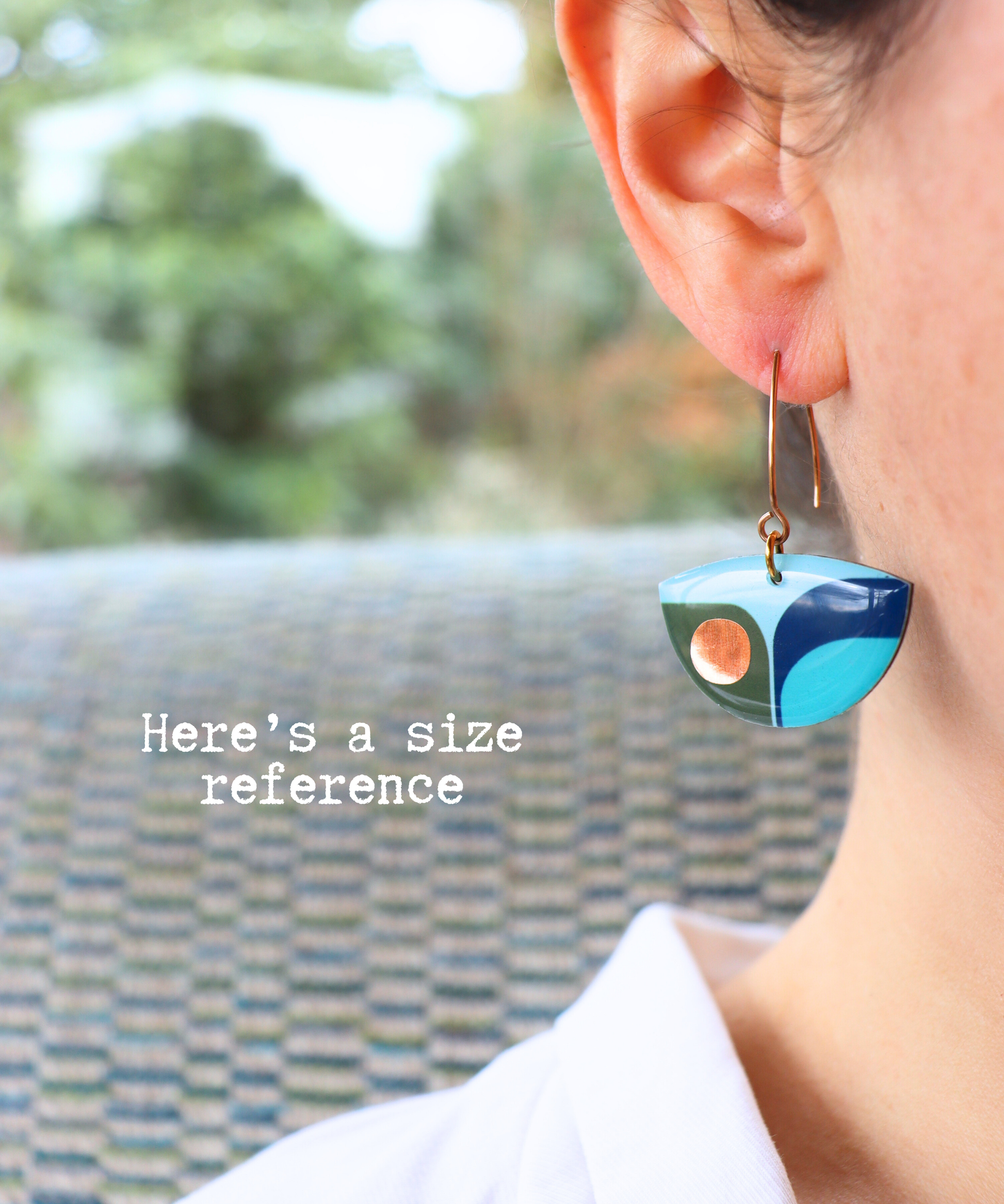 These colourful recycled vinyl record earrings in fuchsia, dark navy blue and deep orange with a warm pop of copper carry a retro inspired, yet contemporary, vibe. The back of the earrings feature the original unaltered vinyl record in all its groovy glory (see 5th photo).