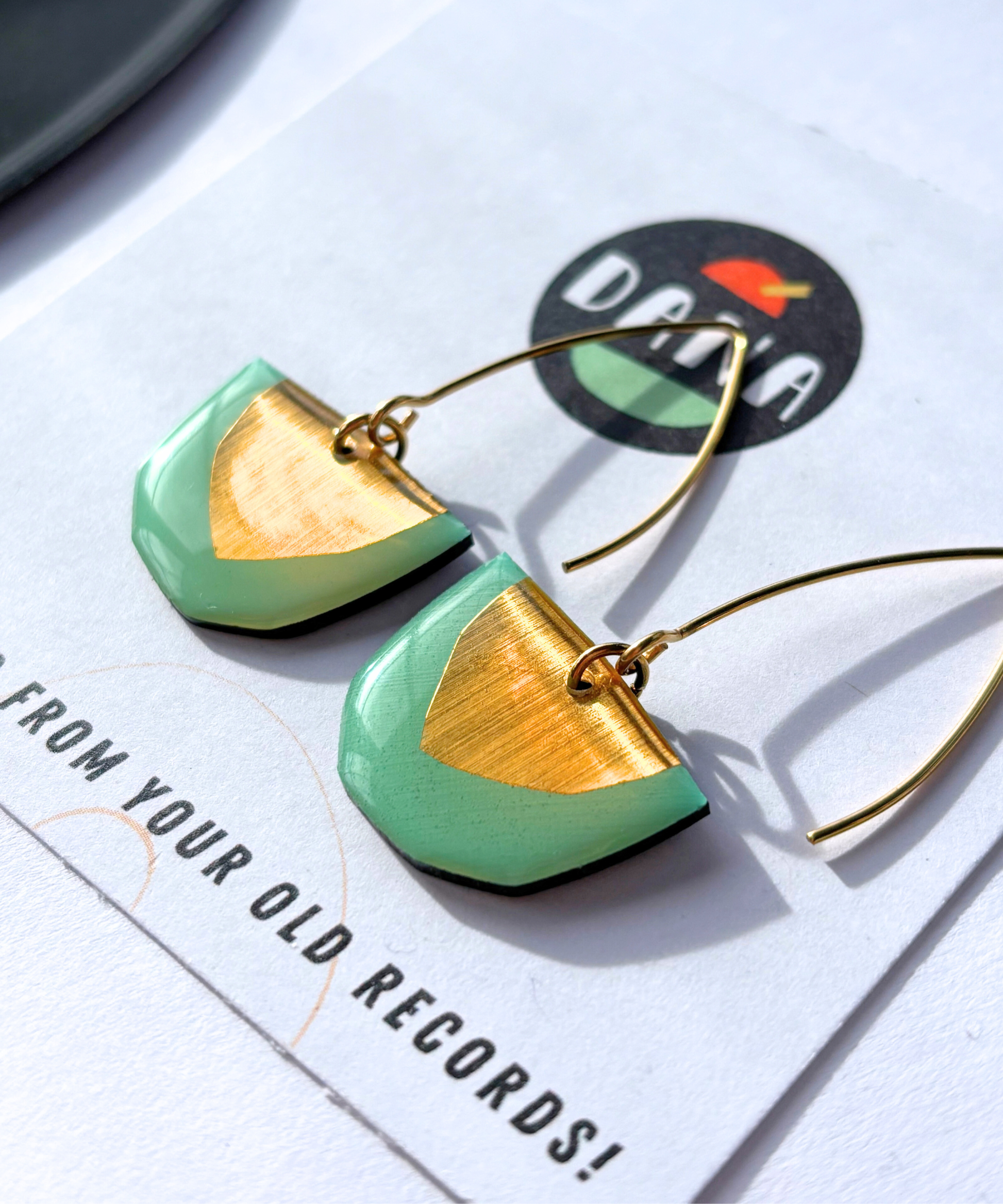 The MACY earrings, upcycled from unwanted vinyl records are oh so chic yet edgy, with contrasting sharp geometric lines and colors combined to that metallic pop that makes the eye linger. This design is a fab present for the vinyl enthusiast in your life or the lover of quirky and unique art jewellery or innovative upcycled design. All pieces are slow made with intention in my little home studio in Co. Kerry, from vinyl records saved from ending up in landfill. Yup, trash has never looked better.
