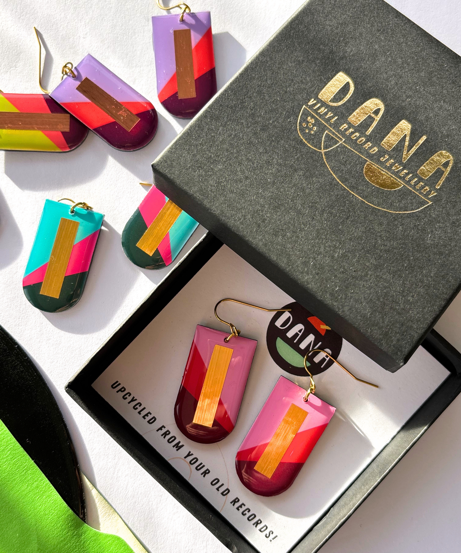 DANA jewellery designs are made using unwanted and beat up vinyl records, saved from ending up in landfill, that once played music for someone, somewhere, back in the day. Each pair carries its own story etched into the grooves of the record and a new chapter is about to begin with you. Yup, rubbish has never looked better.