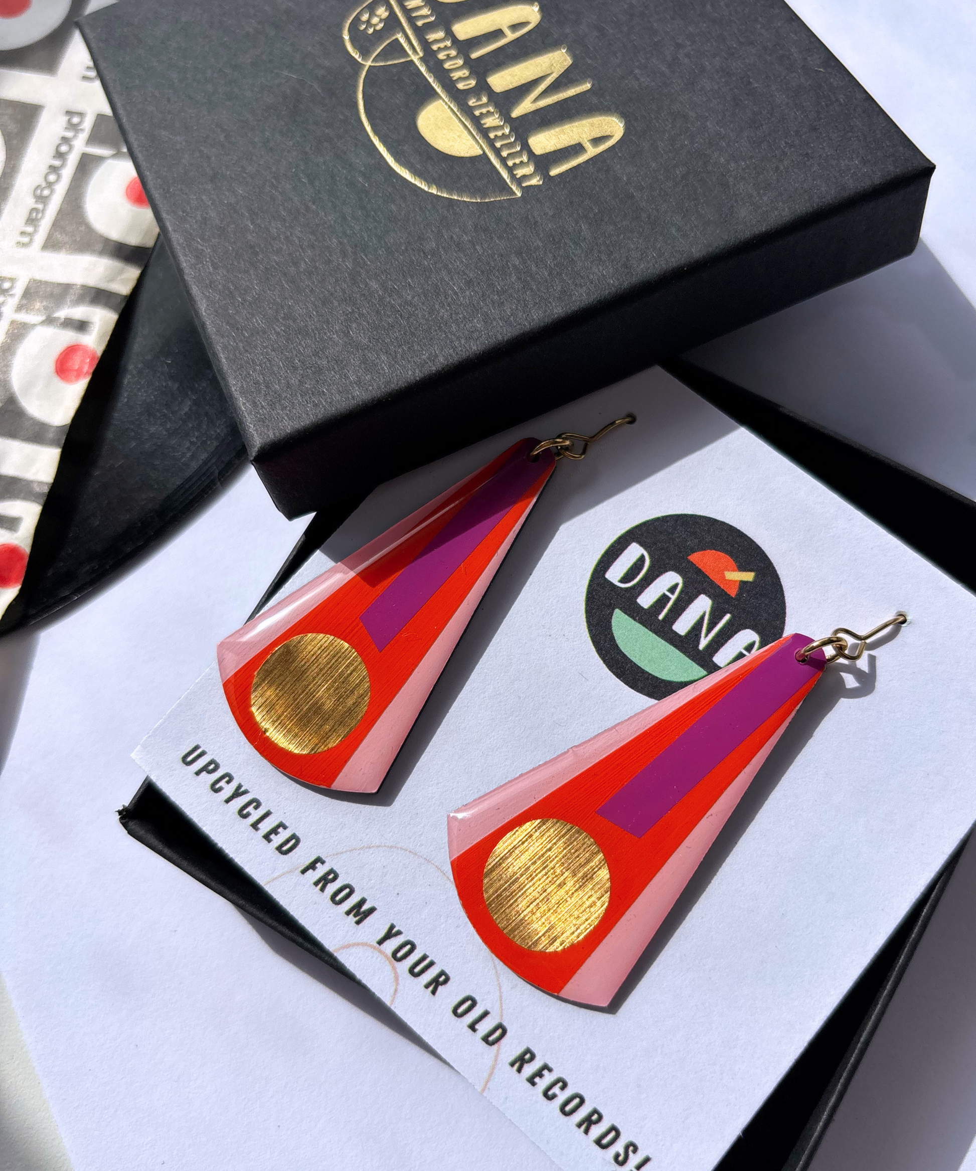 Once, these handmade upcycled earrings were a vinyl record which held someone's favourite song. They have now been reinvented as wearable art, unlike anything else in your jewellery box.