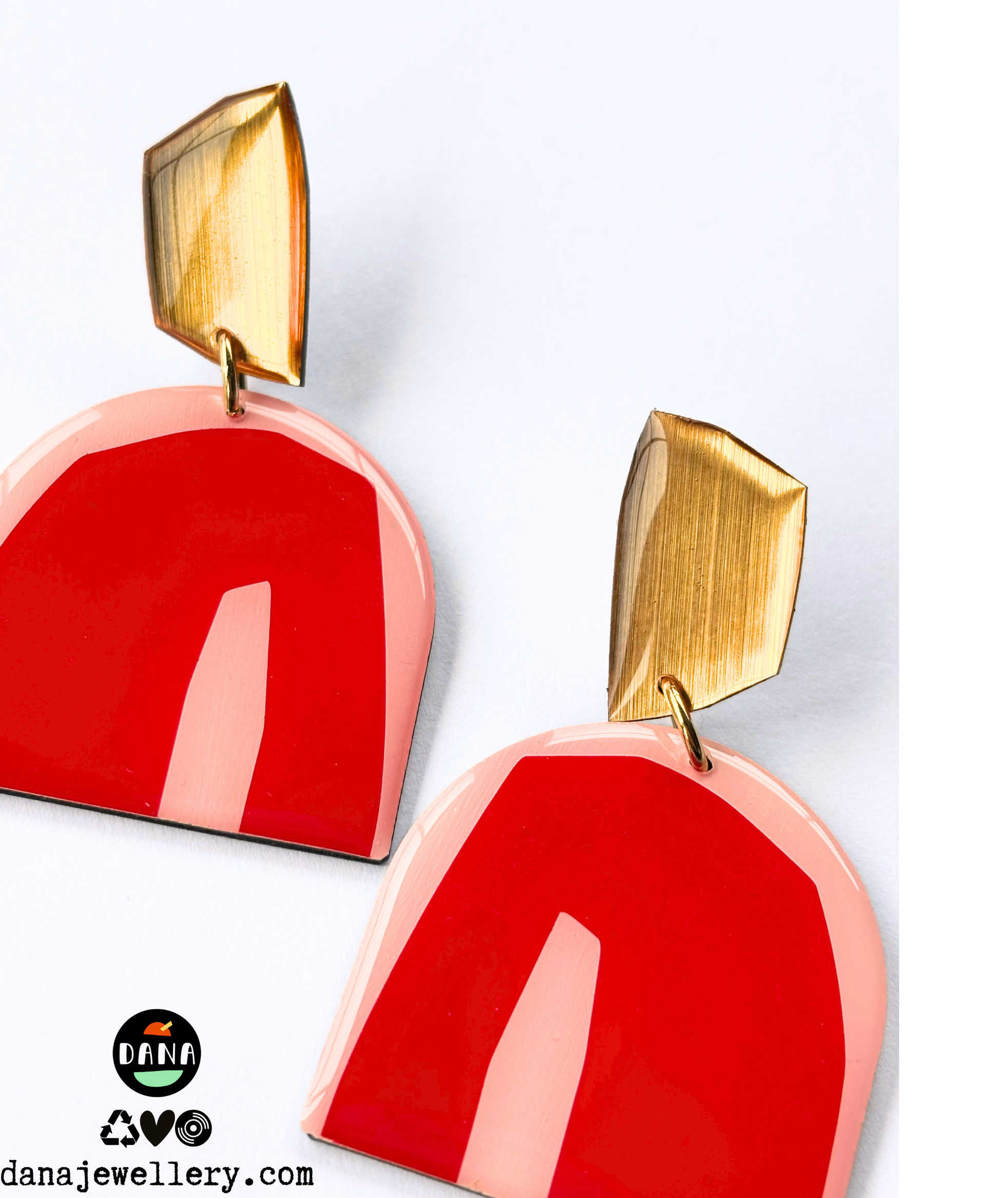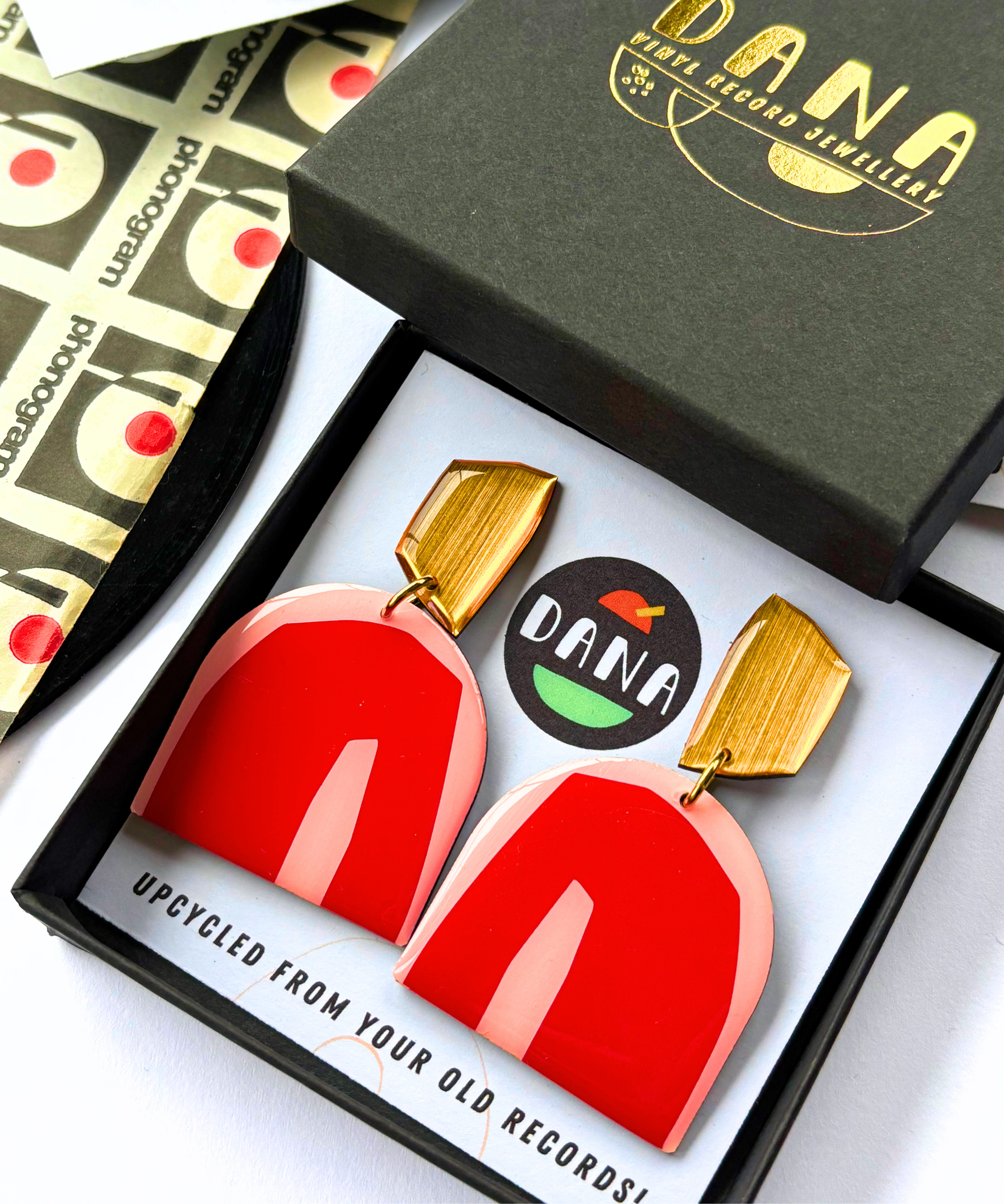 The bold PATTI dangles in vibrant red and lush gold are upcycled from an old vinyl record that was headed for landfill. They are a great present for vinyl lovers, sustainable fashion enthusiasts or anyone on the lookout for that bold artsy accessory.