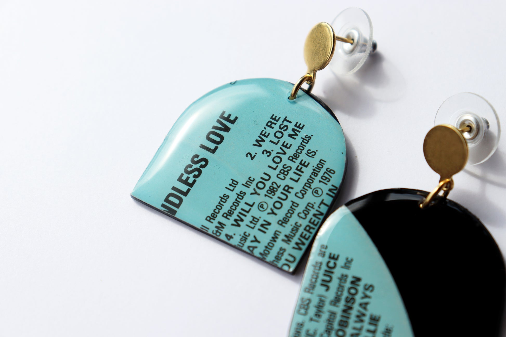 One of a kind vinyl record earrings that used to spin on a turntable in a retro sitting room back in the day? Yup. And even better; these were saved from ending up in a landfill after spending a looong time in a dusty shed, or attic… or who knows where.